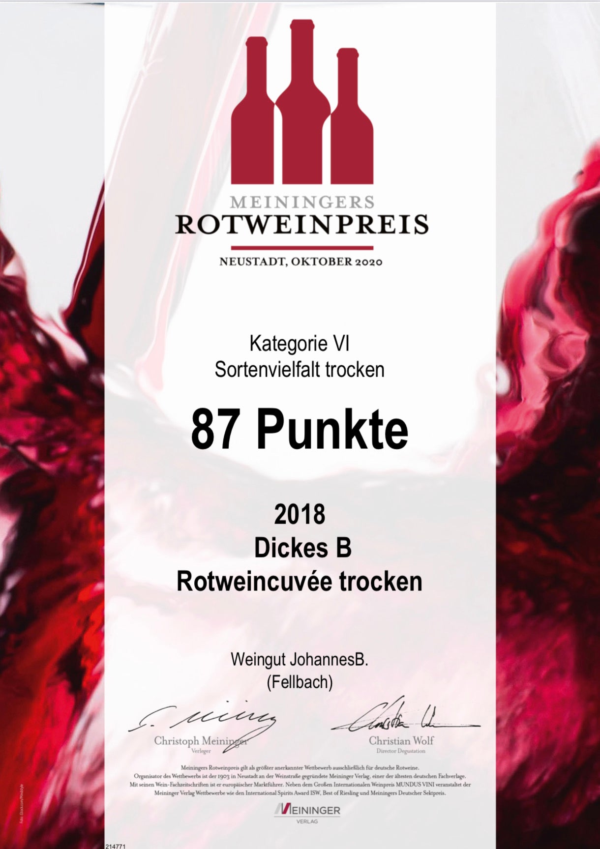 87 Punkte bei Meiningers Rotweinpreis für unsere Rotweincuvée DickesB, das heißt für uns: Jede Menge richtig gemacht. Hier kommen Lemberger und Cabernet Sauvignon aus den besten Lagen Bad Cannstatts zusammen, separat im Eichenholzfass ausgebaut und dann als fertige Weine verschnitten. Blend sagt der Profi dazu. Wir sagen: Ein genialer, tiefer Rotwein mit muskulösen Tanninen und waldig-würzigen Aromen.