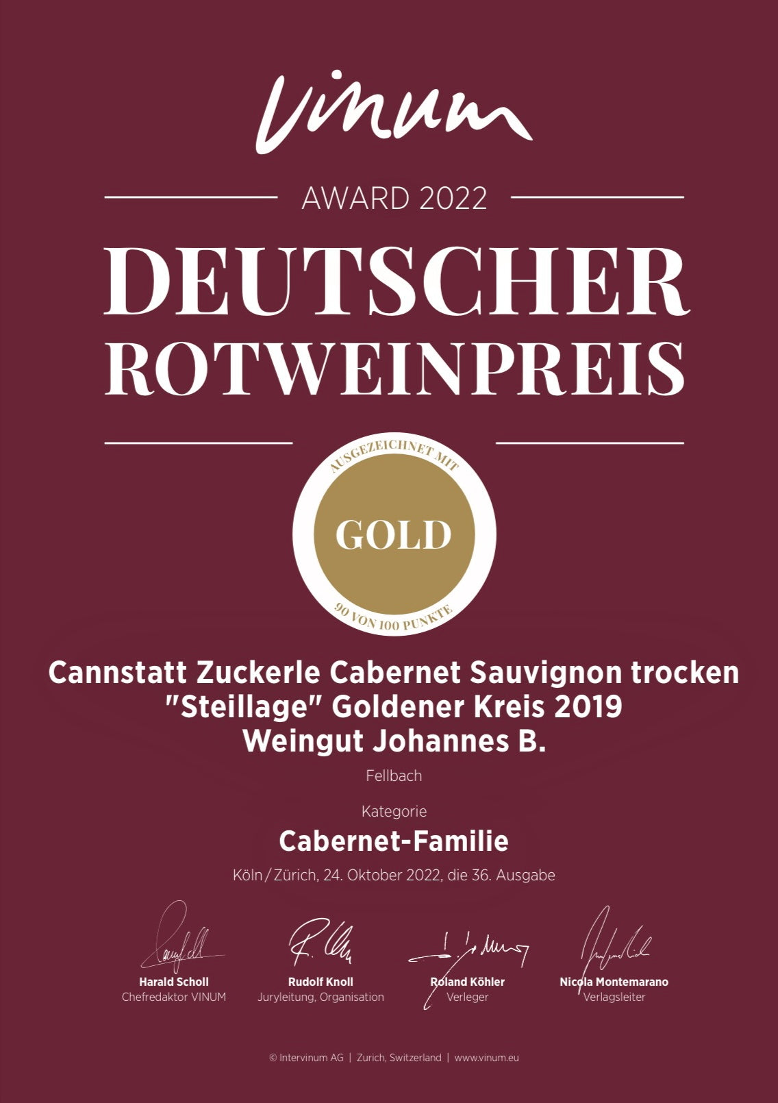 Der geht steil: Wenn es mal etwas kräftiger sein darf, ist es Zeit für den großen Auftritt unseres Cabernet Sauvignons „Steillage“. Der wächst im Cannstatter Zuckerle, einer der steilsten Lagen in ganz Württemberg. Für uns bedeutet das: Handarbeit pur. Für Sie: Genuss pur. Wir reifen ihn im Holzfass und paaren Cassis mit einem Hauch Röstaroma. Der Lohn all dieser Mühen sind ein herrlich langer Nachhall und eine außergewöhnliche Frucht. Zu Wild, Lamm oder Gans können wir uns kaum was Schöneres vorstellen.